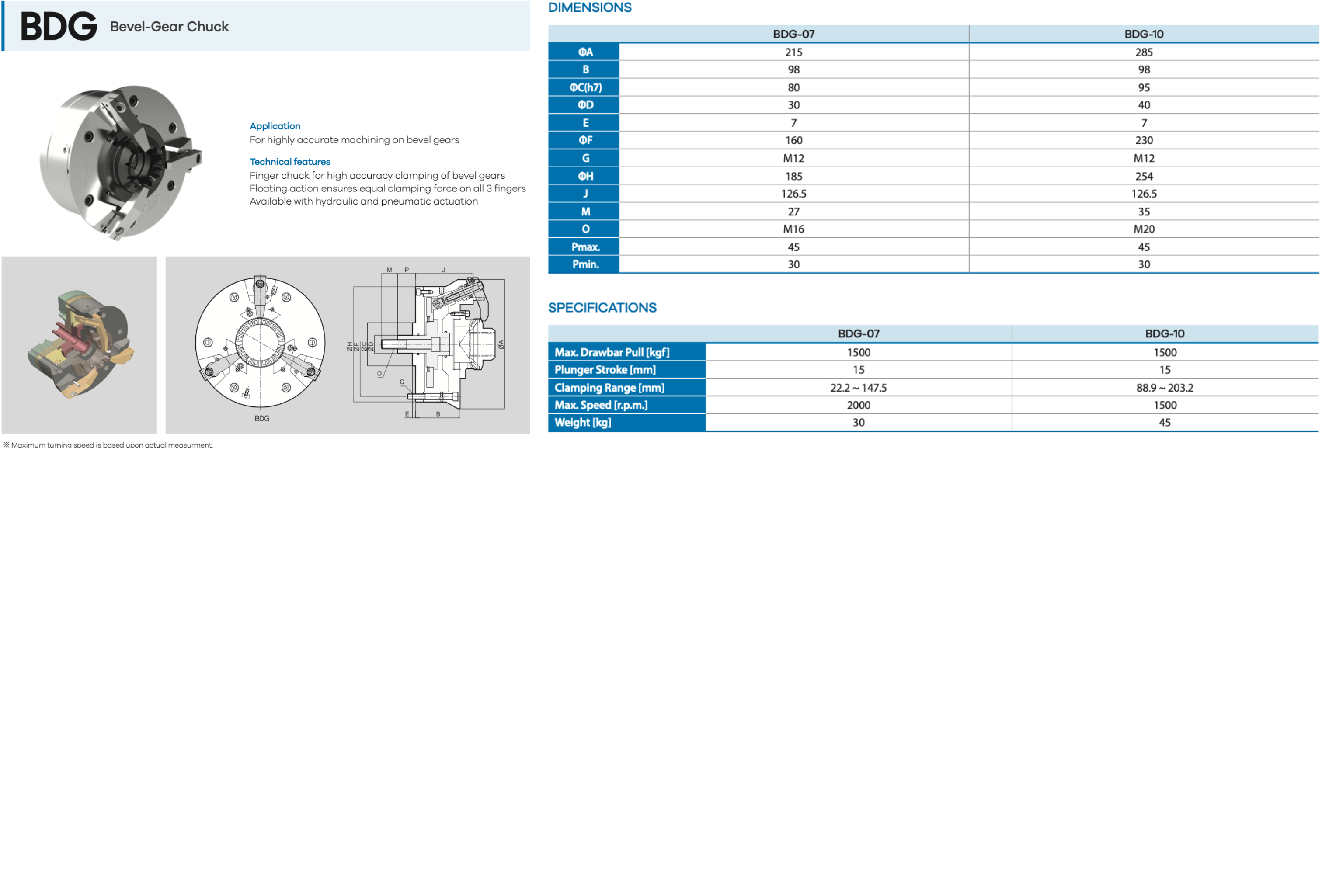 The Samchully BDG Series Bevel-Gear Chucks are engineered specifically for high-precision machining of bevel gears and similar complex components. Designed as a finger-style chuck, the BDG Series ensures uniform clamping through its floating action mechanism, which distributes equal force across all three fingers for superior accuracy and surface finish. Available with either hydraulic or pneumatic actuation, these chucks provide reliable and repeatable performance for demanding gear machining applications. The BDG Series exemplifies Samchully’s commitment to precision engineering, stability, and consistent performance in specialized production environments.