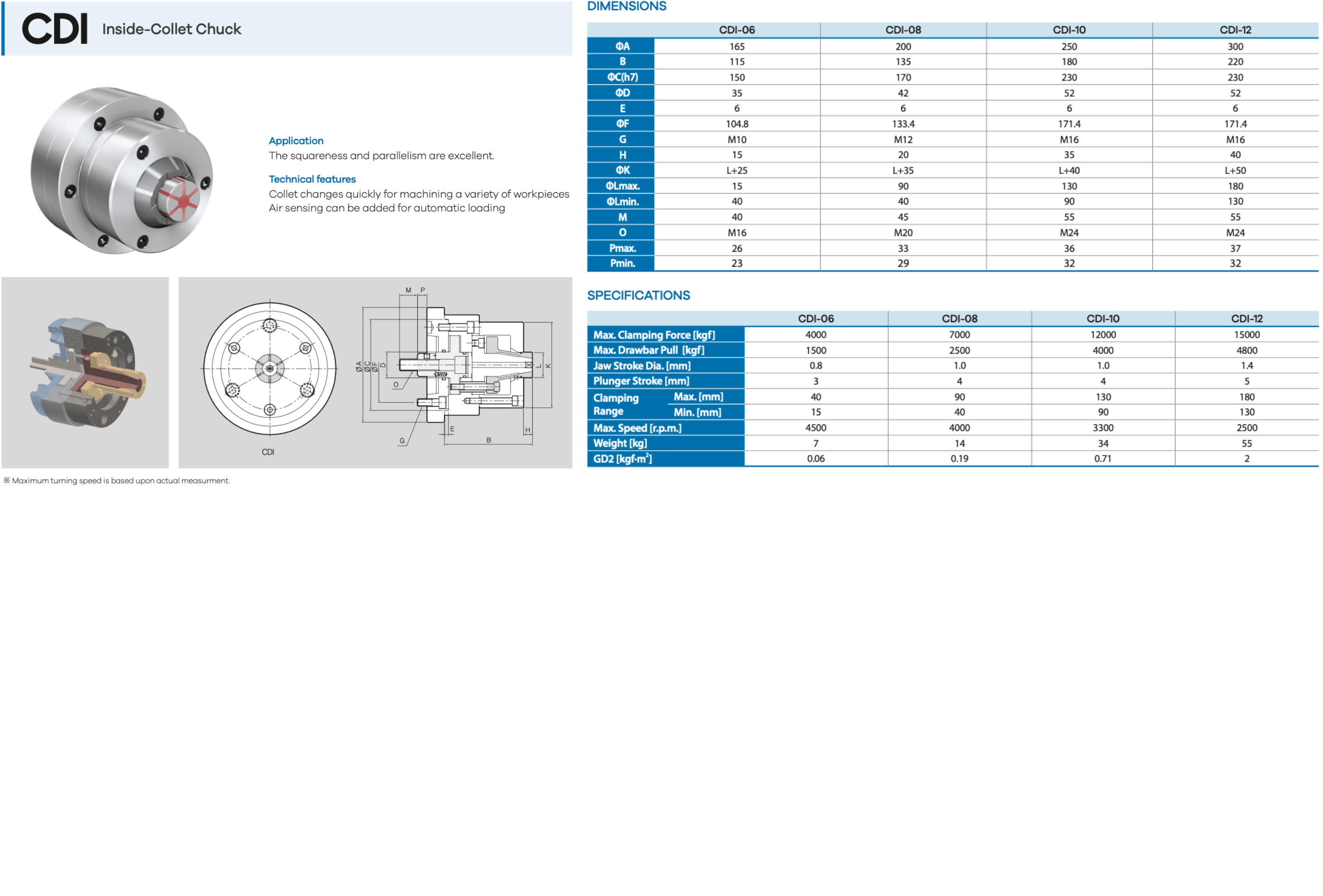 The Samchully CDI Series Special Chucks are precision-engineered for I.D. gripping applications where exceptional squareness and parallelism are required. Designed for versatility, the CDI Series allows for fast collet changes, enabling efficient machining of various workpiece sizes without compromising accuracy. With optional air-sensing capability for automated loading, these chucks support seamless integration into modern production lines. Delivering high clamping force, smooth operation, and consistent precision, the CDI Series ensures reliable performance and stability in even the most demanding machining environments.
