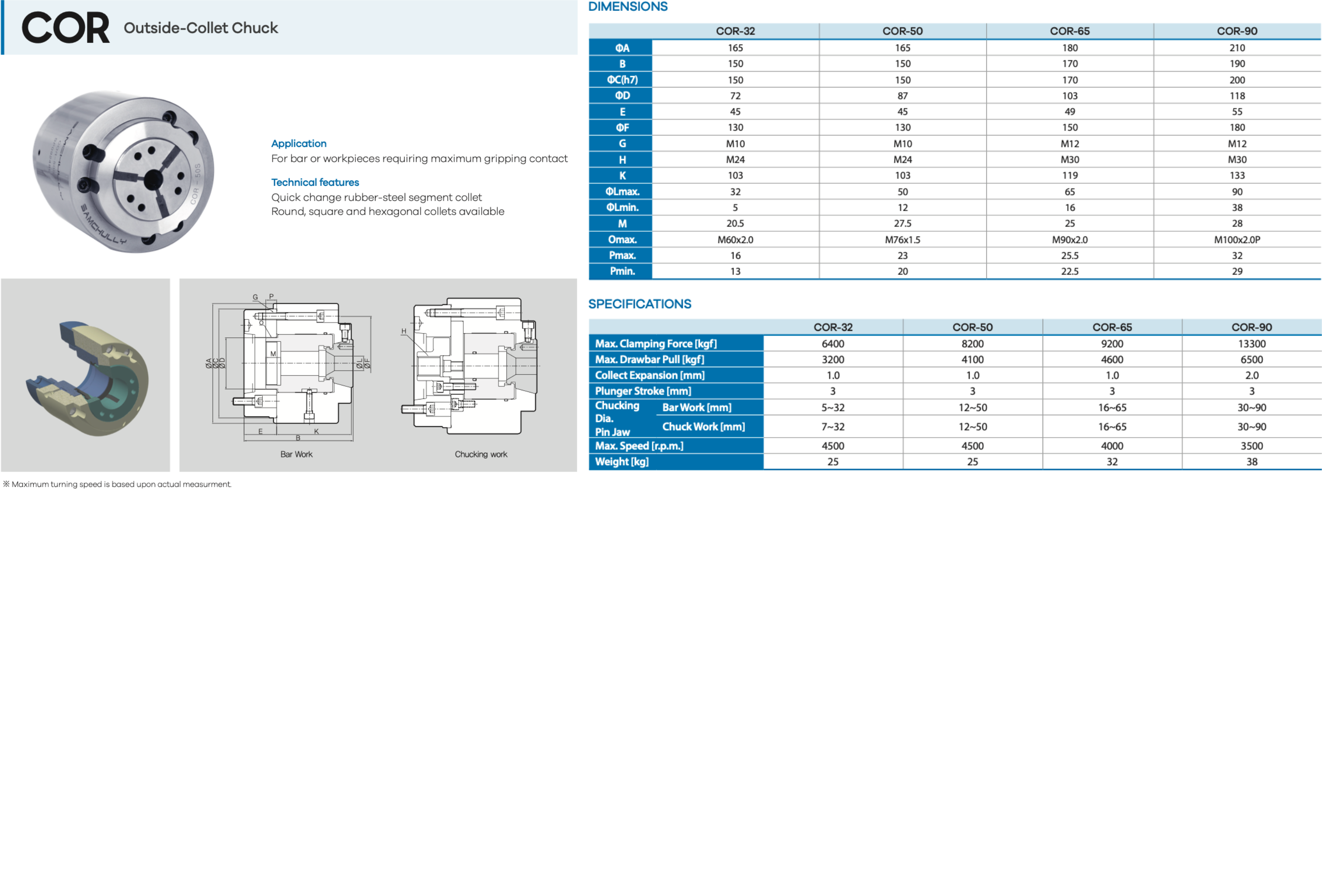 The Samchully COR Series Special Chucks are designed for O.D. gripping applications that demand maximum contact and versatility, making them ideal for both bar work and various shaped workpieces. Featuring quick-change rubber-steel segment collets, the COR Series allows for rapid setup and consistent precision across different part geometries. Available in round, square, and hexagonal collet options, these chucks provide strong, stable clamping performance for a wide range of machining needs. With Samchully’s proven engineering and durability, the COR Series ensures excellent accuracy, repeatability, and reliability in high-production environments.