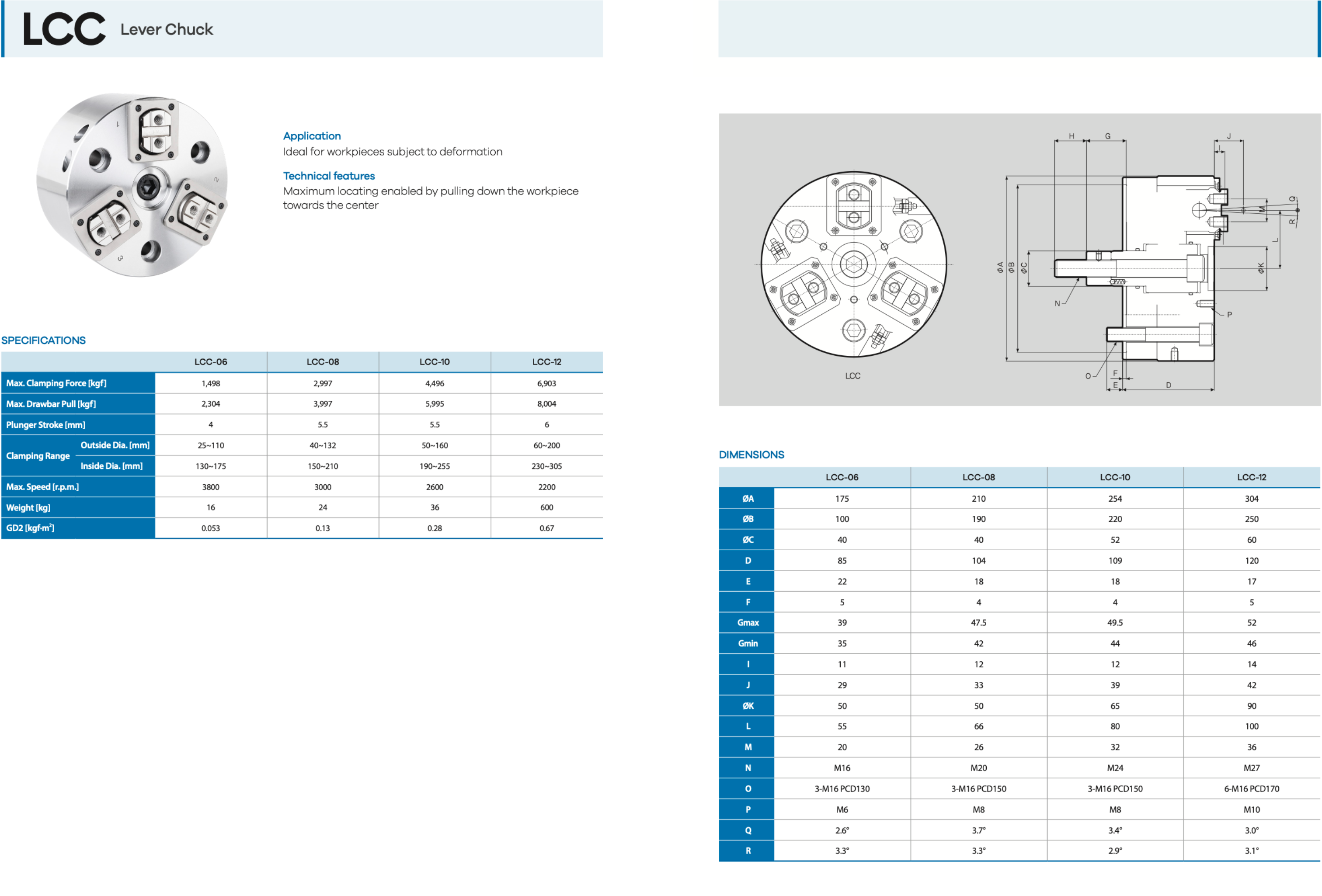 The Samchully LCC Series Lever Chucks are designed for workpieces prone to deformation, offering exceptional stability and accuracy during clamping. Featuring a precision lever mechanism, the LCC Series pulls the workpiece down toward the chuck center to ensure maximum locating accuracy and repeatable positioning. This pull-down action minimizes distortion while maintaining a secure grip, making the LCC Series ideal for thin-walled or delicate components. Built for dependable performance and long-term durability, these chucks deliver consistent precision and reliability across a wide range of high-accuracy machining applications.