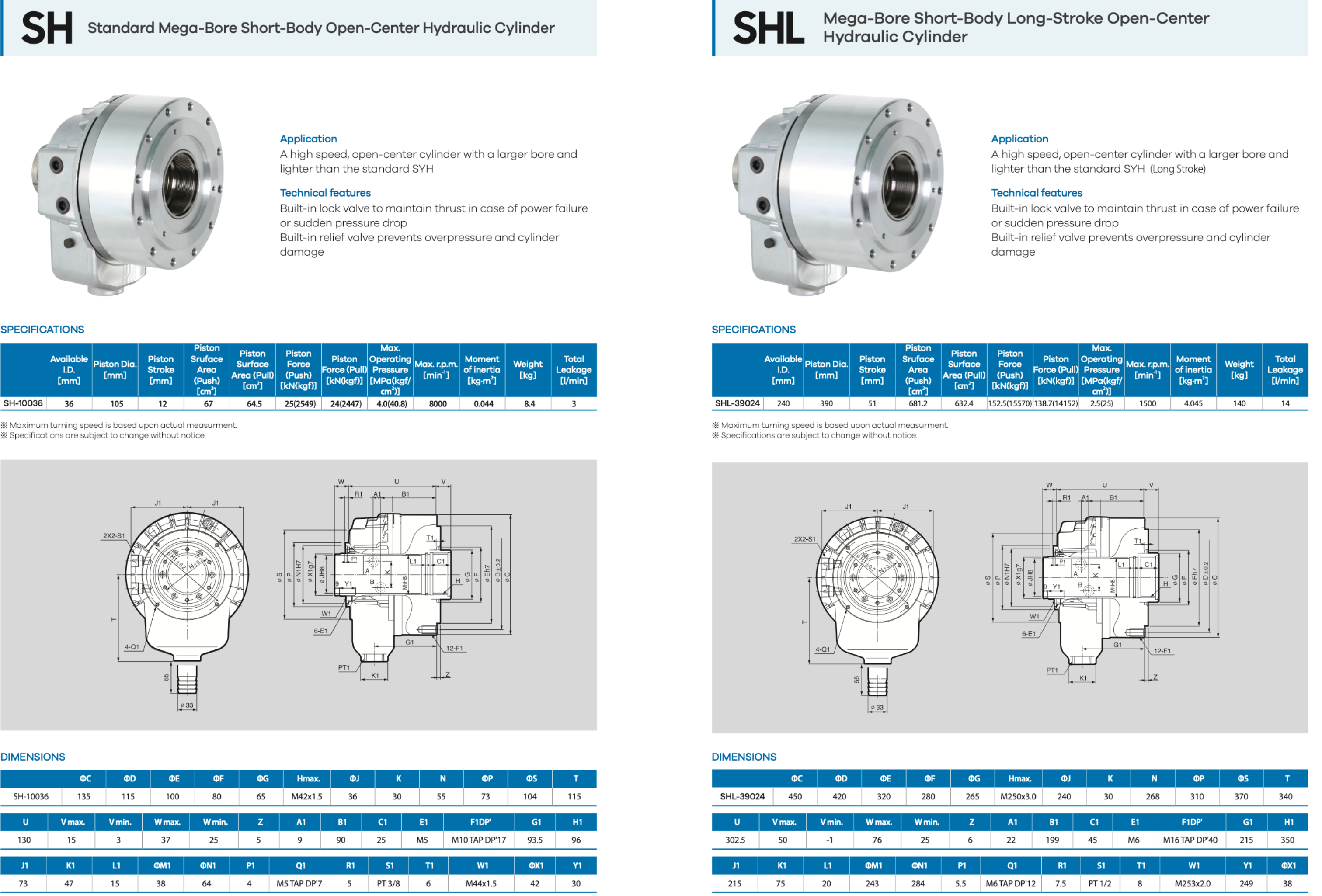 The SH/L Series builds on the proven SH design with a long-stroke configuration that increases actuation range while maintaining compact overall dimensions. A built-in lock valve safeguards against loss of thrust during power failure, while the integrated relief valve protects against overpressure and potential system damage. Constructed with high-strength components for long service life, the SH/L Series delivers steady, high-force hydraulic performance and smooth operation at spindle speeds up to 8,000RPM making it ideal for large-diameter, precision turning applications.